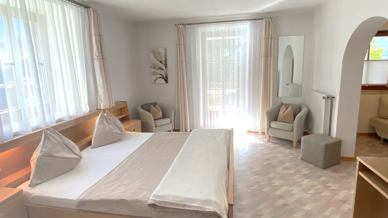 Schlafzimmer, Küche, Wohnzimmer mit zusätzlicher Schlafgelegenheit-grosszügige eigene Terrasse, Balkon